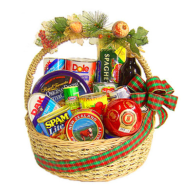a Christmas BasketMarca Pina Queso de Bola (approx. 500g), Dak Chopped Ham (454g), Vienna Sausage (155g), Royal Pasta Hunt's spaghetti sauce Tulip Pate Di Fegato (125g), Palm Corned Beef & Garlic (340g), Spam Garlic (340g), Spam Lite (340g), and Spam with Cheese (340g) Spam hormel (340g) Dennis Cookies (254g), Del Monte Tropical Fruit Cocktail (850g), Peach halves (weight: 527g), Pinapple Juice Drink (1liters) and Hardys Red (750ml)