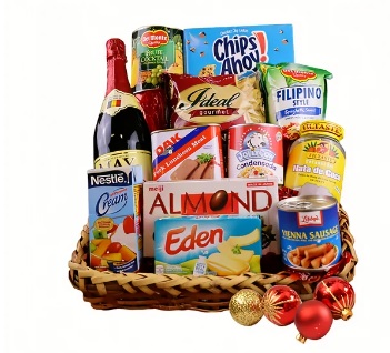 Festive CheerNCLUSIONS:- May Sparkling Red Grape Juice 750ml - Del Monte Fruit Cocktail 825g - Chips Ahoy Original 266g - Del Monte Filipino Style Spaghetti Sauce 500g - Ideal Penne Rigate 500g - Filtaste Nata De Coco White 340g - Dak Pork Luncheon Meat 340g - Eden Cheese 160g - Nestle All Purpose Cream 250ml - Libby's Vienna Sausage 130g - Meiji Almond Chocolate 88g - Jollycow Condensada 390g