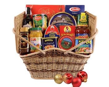 Treasure Chest BasketNCLUSIONS:- Lindt Lindor Milk Chocolate 168g - Barilla Fusilli 500g - Del Monte Fruit Cocktail 825g - Royal Danks Danish Cookie Collection 454g - Happy Day Orange Juice 1L -Cranberry juice ccoktail 1L - Hereford Cooked Ham 454g - Sun-Maid Raisin 250g - Pasta Sauce 677g - Sliced Peaches 665g - Palm Corned Beef 326g - Spam Lite Luncheon Meat 340g - Nescafe Coffee 100g - Luncheon Loaf 340g