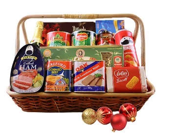 Yuletide Basket - BINCLUSIONS:- Lindor Smooth Milk 200g - Swissmiss Milk Chocolate 10 x 260g - May Sparkling White Grape Juice 750ml - Del Monte Fruit Cocktail 822g - Jolly Peach Halves 822g - San Remo Bolognese Pasta Sauce 500g - Hereford Cooked Ham 16oz - Dona Elena Al Dente Lasagna Pasta 500g - Pringles Original 107g - Hereford Corned Beef 340g - Dak Pork Luncheon Meat 340g - Lotus Original Caramelized Biscuit 125g
